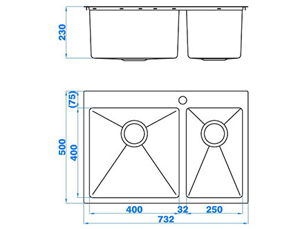 型號:5426款式:雙盆安裝方式:嵌入式總尺寸:732*500 mm大盆:400*400*230 mm小盆:250*400*230 mm